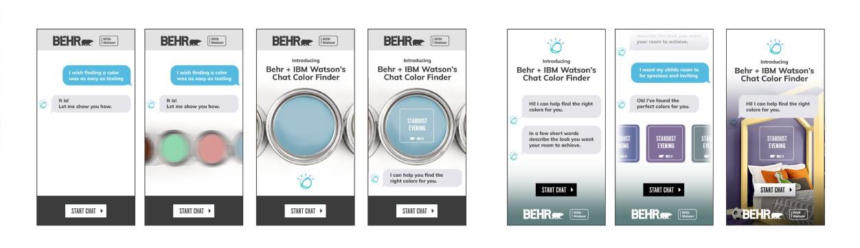 Working with our agency partner, internal teams, and the IBM Watson Ads group, we created BEHR’s first AI‑powered chatbot experience. Built on room type, mood, style, and a rich library of color descriptions, the Watson chatbot guided users through natural‑language conversation and simple multiple‑choice prompts to deliver a personalized color palette. The learnings from this early experiment provided valuable insight into conversational behavior, user expectations, and color‑selection logic. All of this informed thinking that later contributed to the 2025 launch of ChatHue, BEHR’s next‑generation AI color assistant.