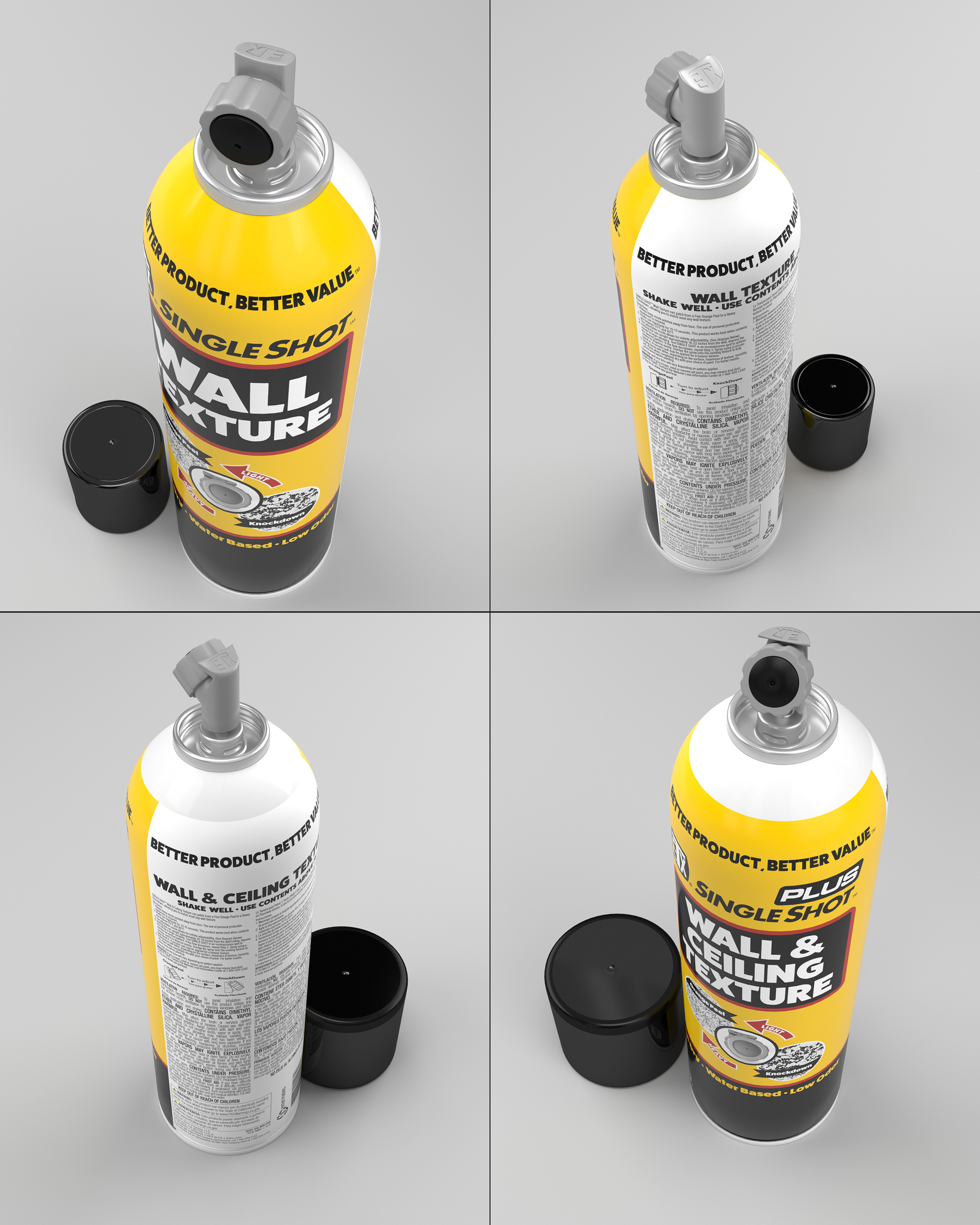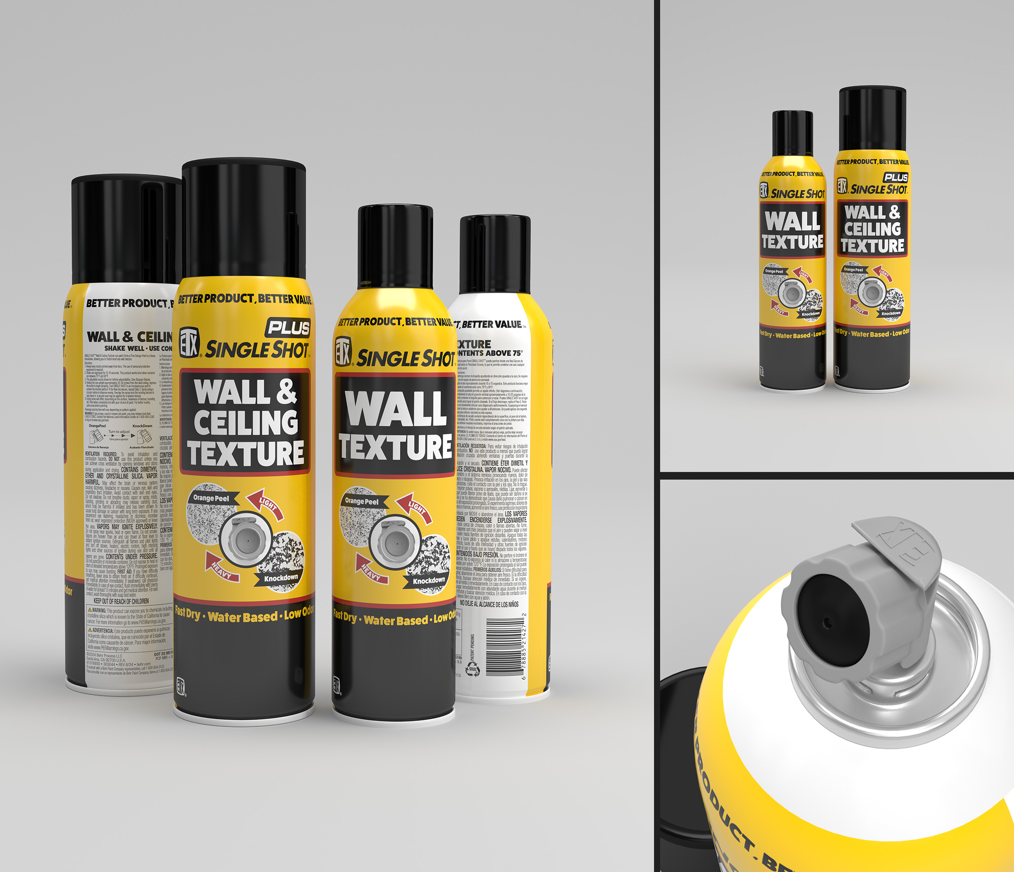The ETX Wall & Ceiling Texture Sprays project required photorealistic product renders to support the brand’s digital presence and retail partners. No 3D models or CAD files were provided—only label artwork—so each product was built from scratch to create clean, accurate visuals suitable for web, e‑commerce, and point‑of‑sale advertising.