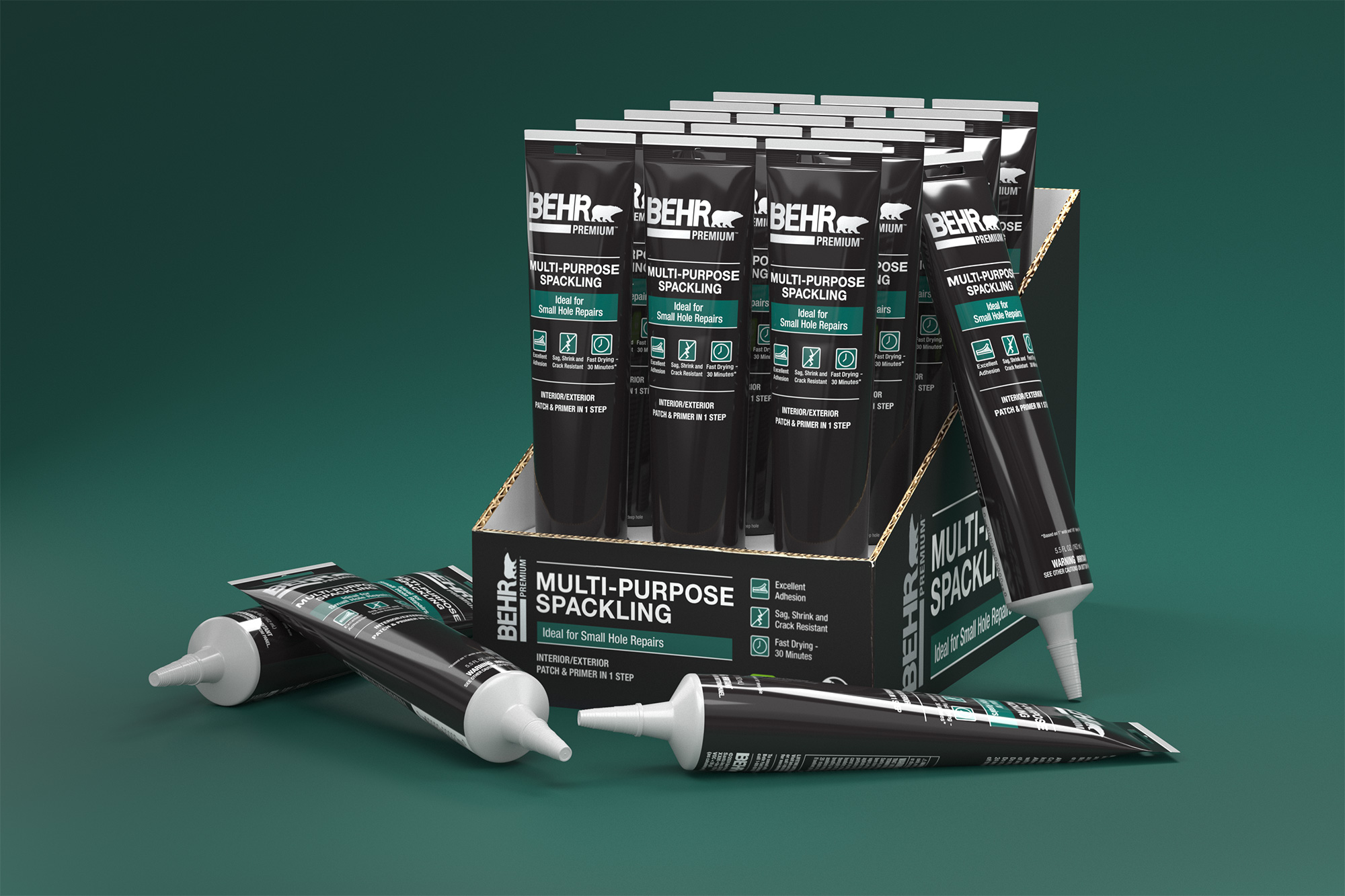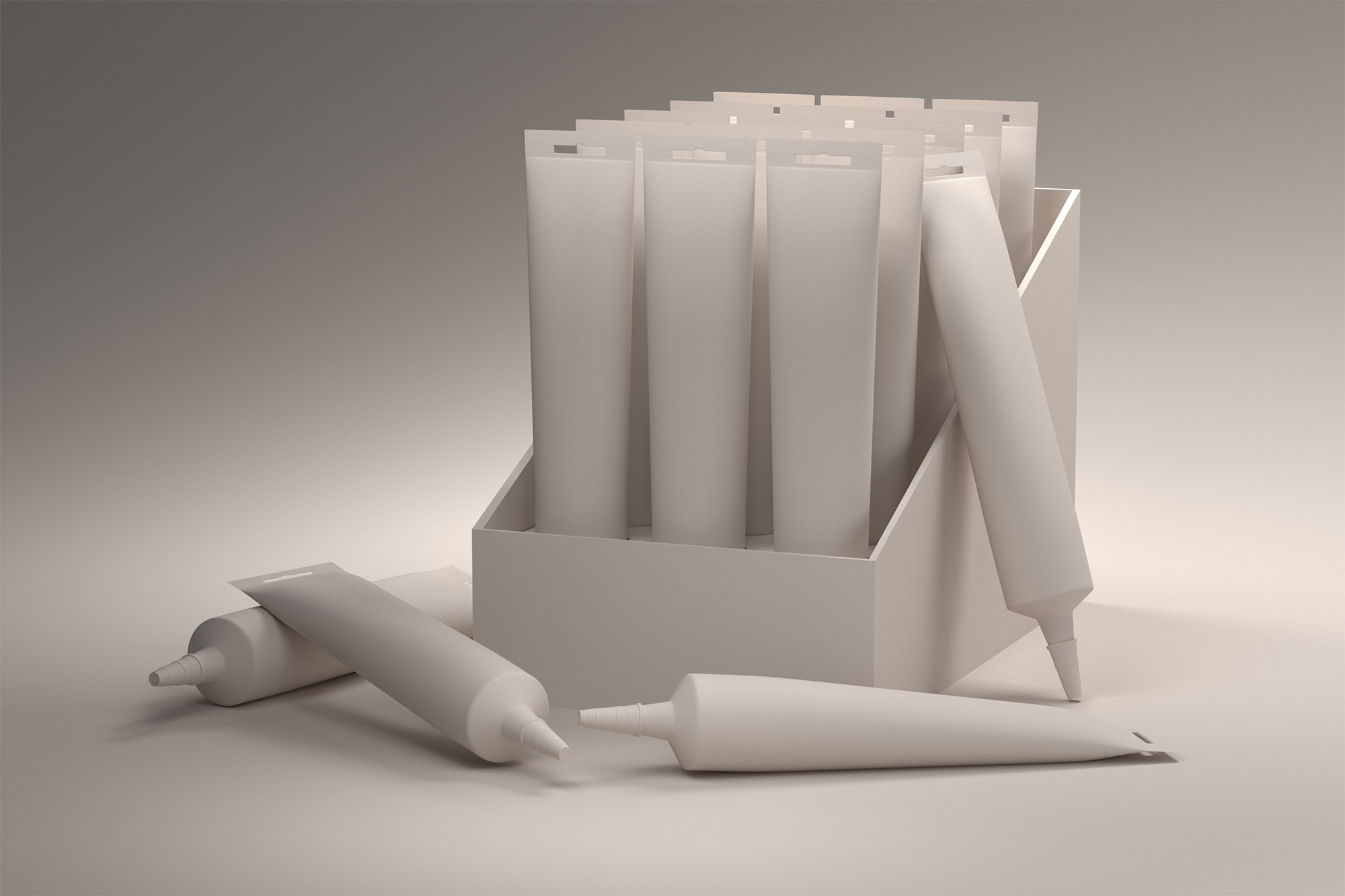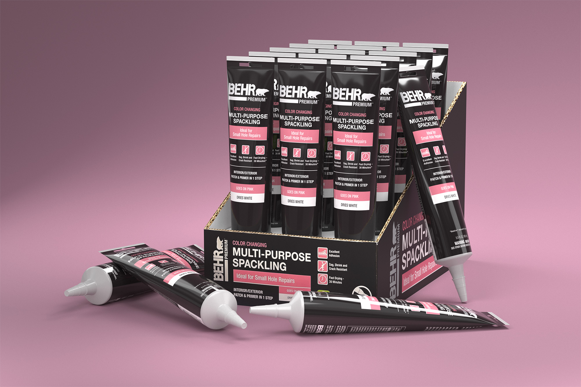 Launching the company’s first caulks and sealants line required a full suite of photoreal packaging renders to support marketing, print, retail, and digital channels. Unlike early‑stage innovation projects, this work relied on established packaging norms and vendor‑defined manufacturing processes. No CAD files or 3D assets were provided, so I built each product as a precise digital twin—using physical samples and micrometer measurements to recreate accurate geometry and proportions. The final deliverables included beauty renders, web‑ready product imagery, in‑store shelf product and placement previews.