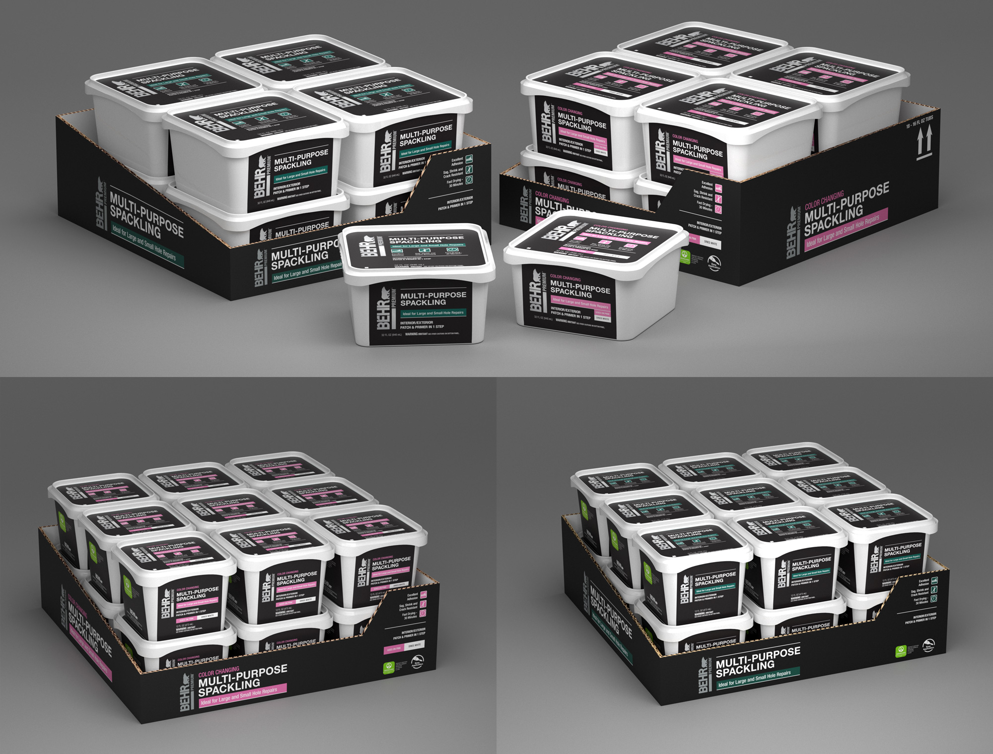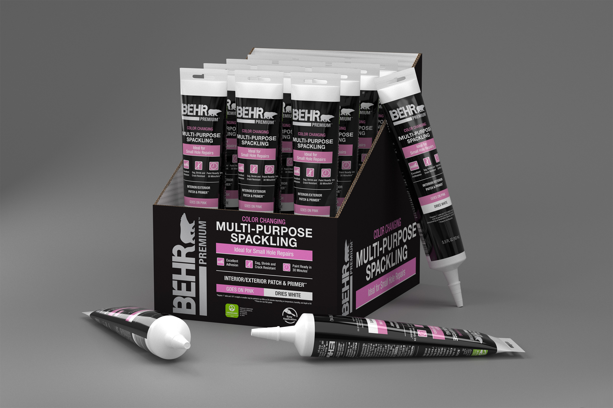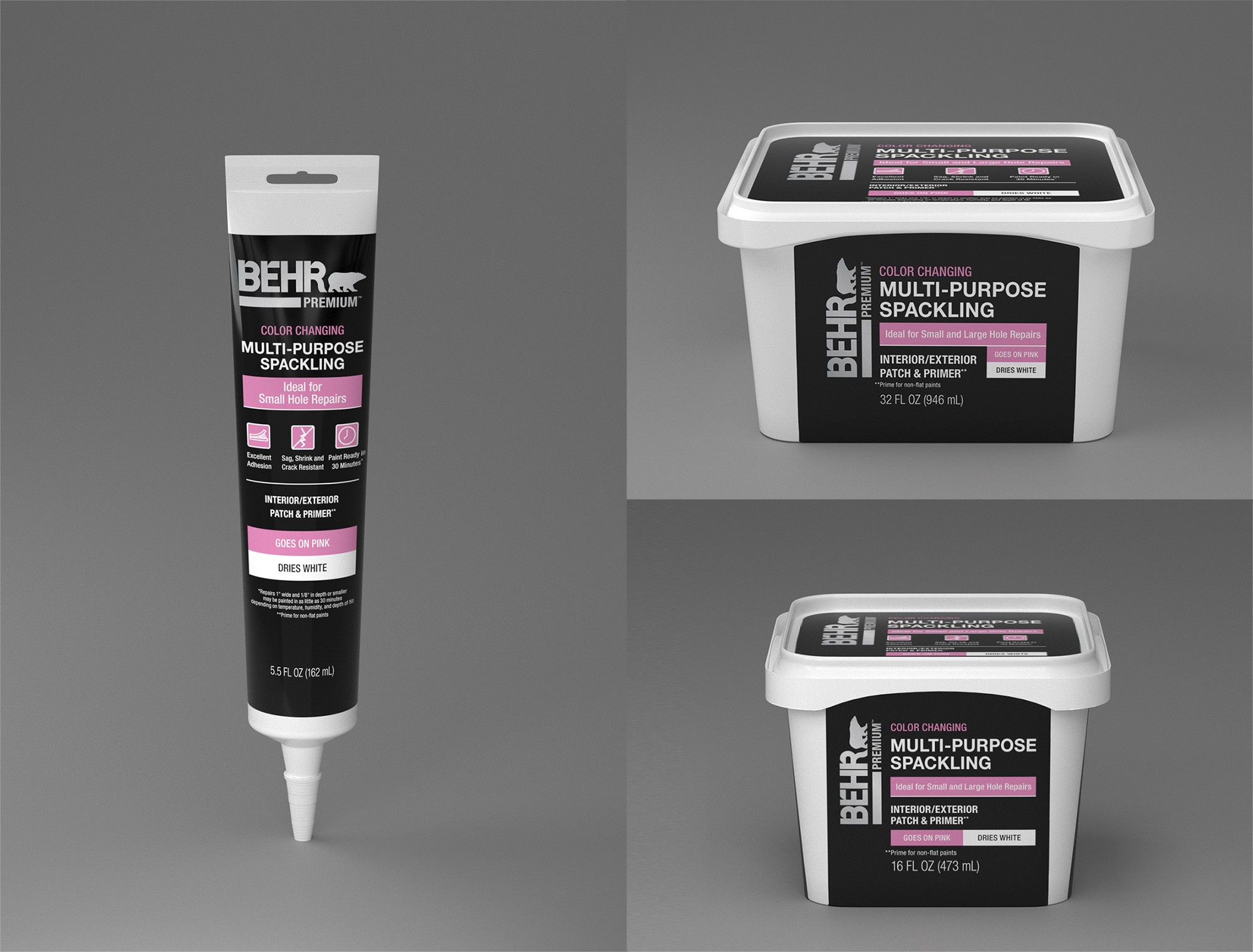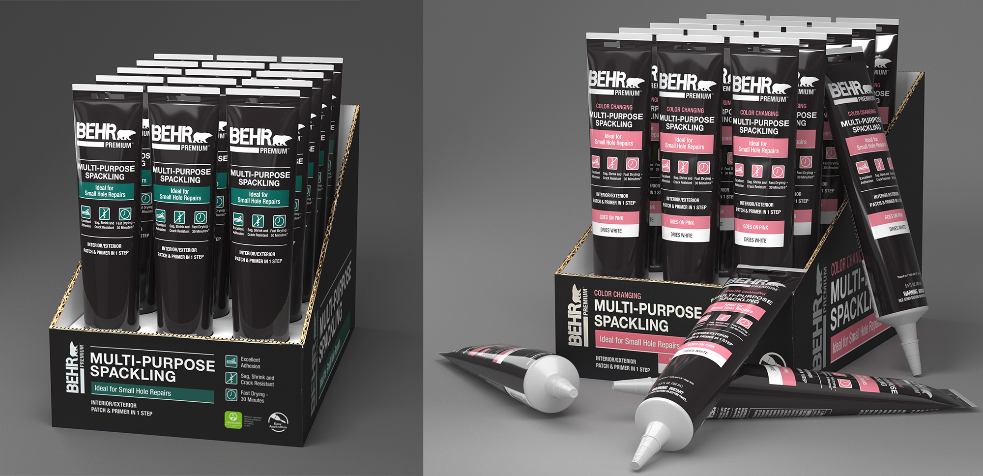 Launching the company’s first caulks and sealants line required a full suite of photoreal packaging renders to support marketing, print, retail, and digital channels. Unlike early‑stage innovation projects, this work relied on established packaging norms and vendor‑defined manufacturing processes. No CAD files or 3D assets were provided, so I built each product as a precise digital twin—using physical samples and micrometer measurements to recreate accurate geometry and proportions. The final deliverables included beauty renders, web‑ready product imagery, in‑store shelf product and placement previews.
