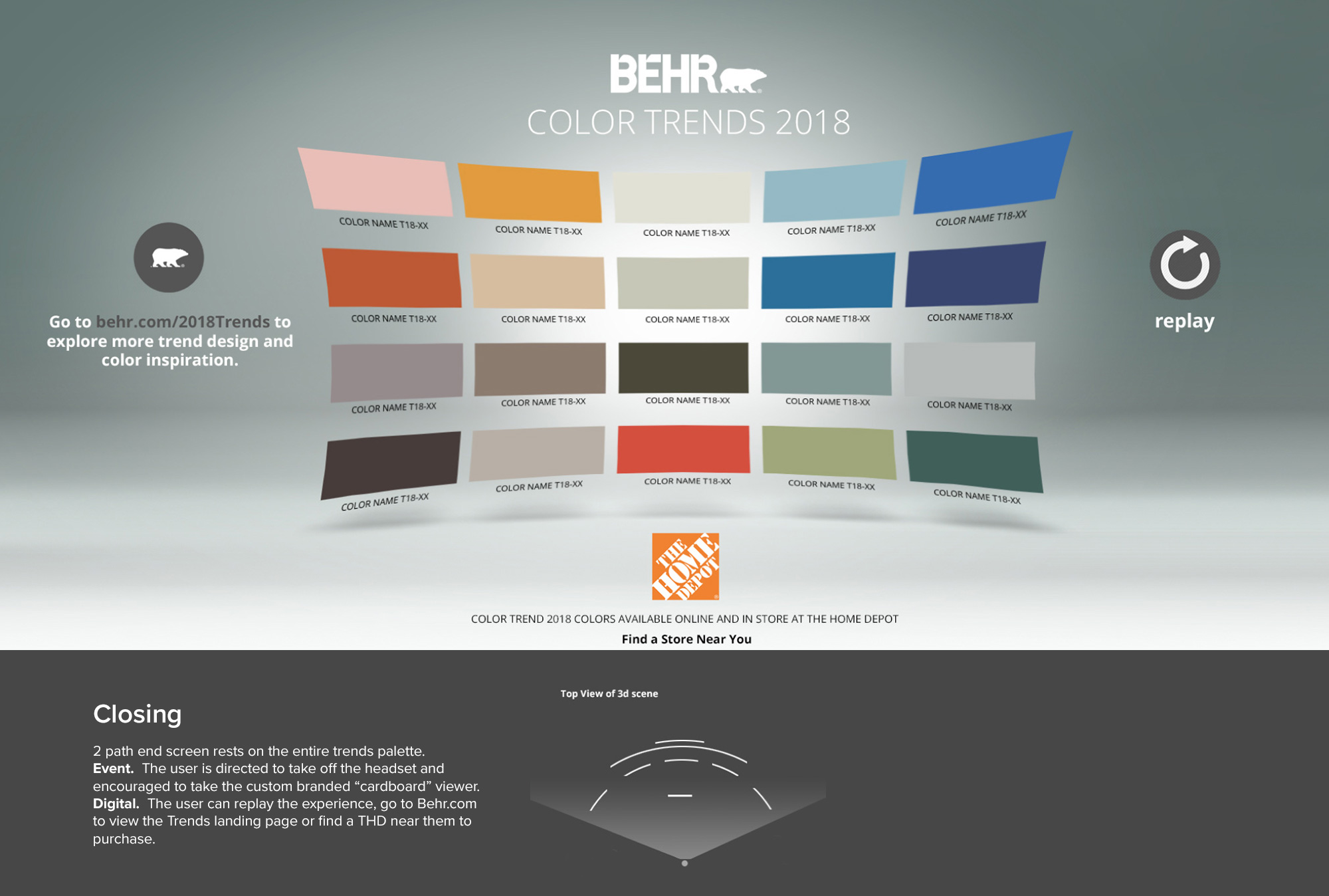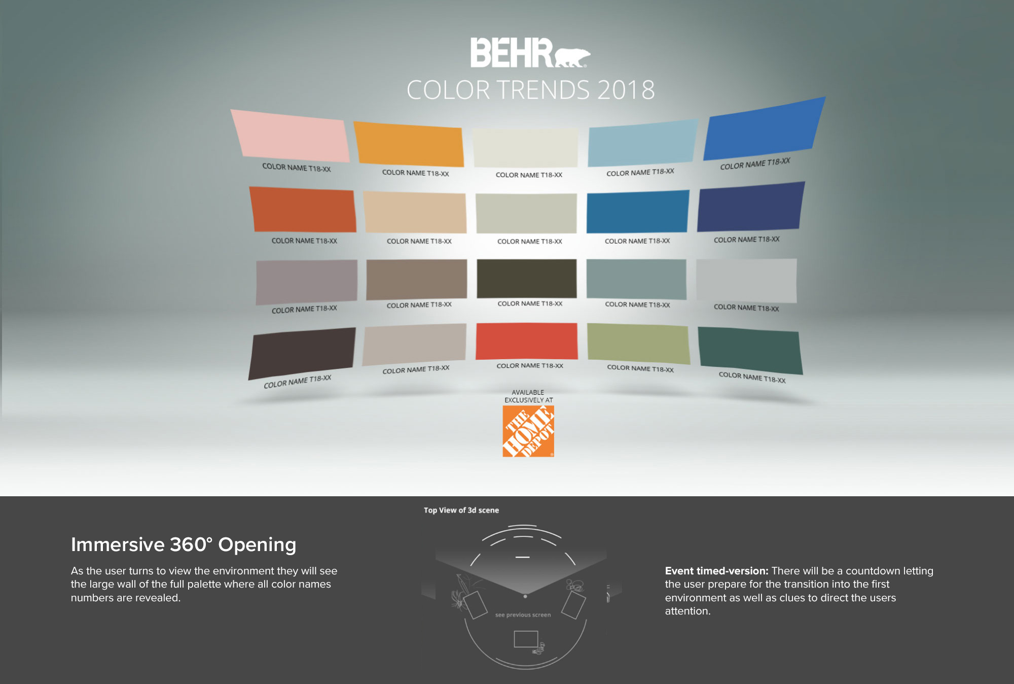 Created as part of a broader cross‑team event initiative, the VR experience became a key digital asset—extended across the Trends landing page, BEHR.com, YouTube, and social channels. Its reach far outlasted the physical installation, earning more than a million views on YouTube and becoming BEHR’s most‑engaged video at the time.