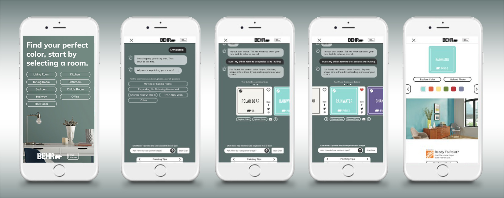 Working with our agency partner, internal teams, and the IBM Watson Ads group, we created BEHR’s first AI‑powered chatbot experience. Built on room type, mood, style, and a rich library of color descriptions, the Watson chatbot guided users through natural‑language conversation and simple multiple‑choice prompts to deliver a personalized color palette. The learnings from this early experiment provided valuable insight into conversational behavior, user expectations, and color‑selection logic. All of this informed thinking that later contributed to the 2025 launch of ChatHue, BEHR’s next‑generation AI color assistant.