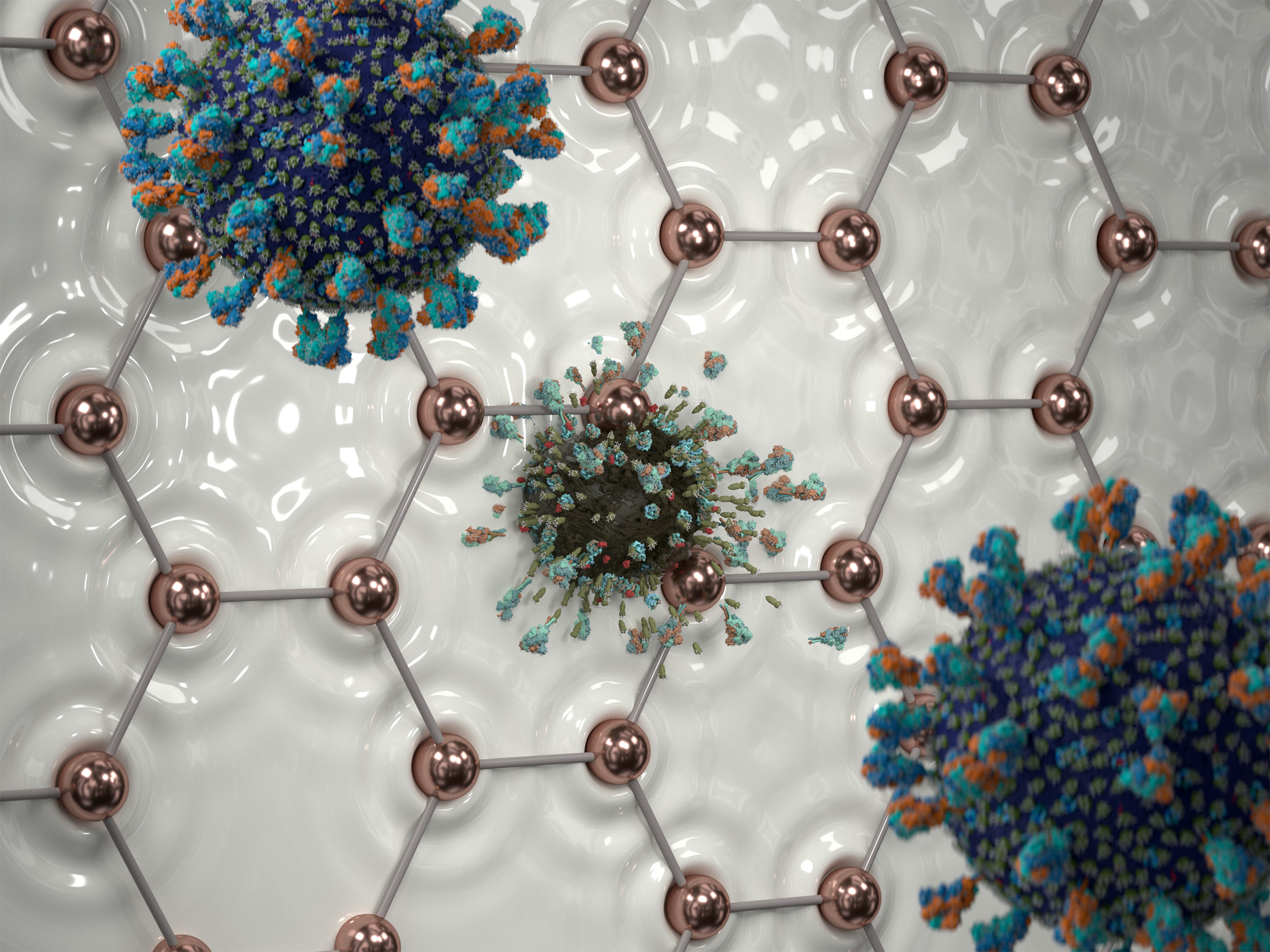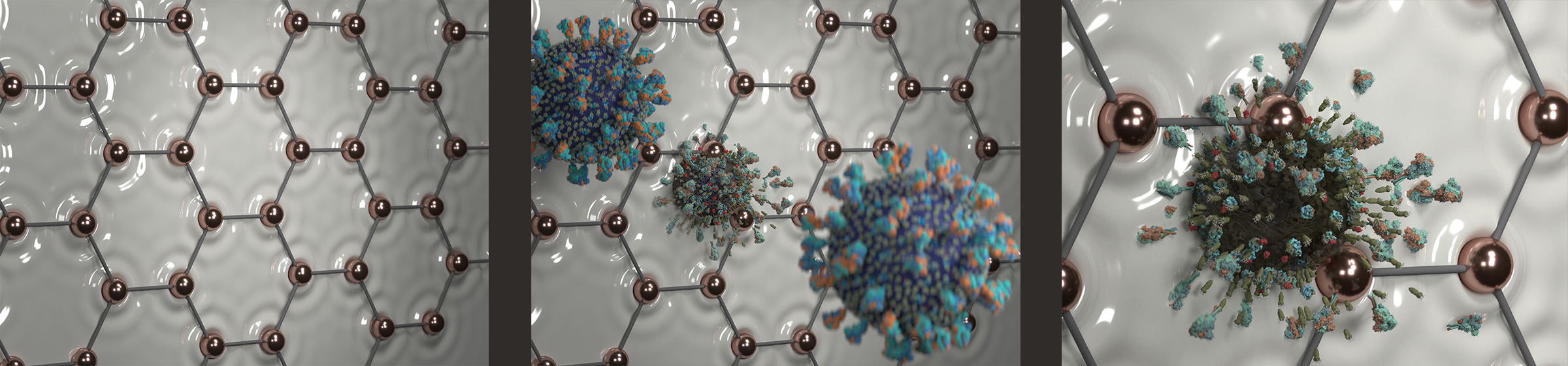 As a naturally curious person, I began by studying scientific diagrams of copper elements and developing early concept sketches. Those initial explorations leaned too far into technical accuracy, so the team redirected the visuals toward something more intuitive: copper ions infusing the paint, a protective layer forming on the surface, and a grid actively neutralizing SARS‑CoV‑2 on contact.