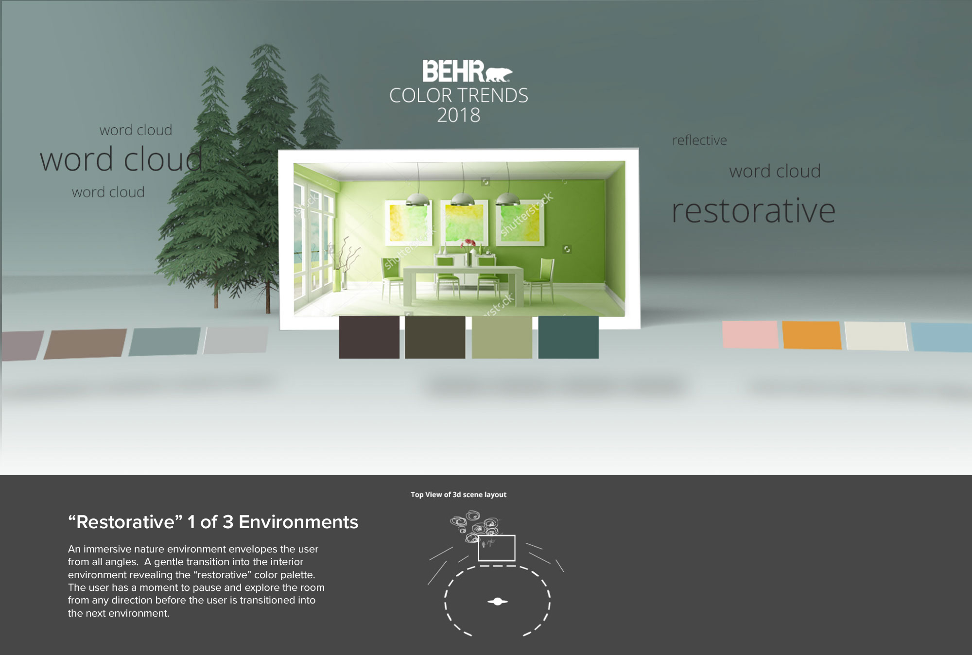 The Color Trends 2018 VR Experience brought BEHR’s annual palette to life through an immersive 360° activation launched in New York’s Grand Central Station. Using custom VR viewers and mobile‑driven access, audiences stepped into a nature‑inspired color story that blended atmospheric environments with interior design in a fully panoramic format.